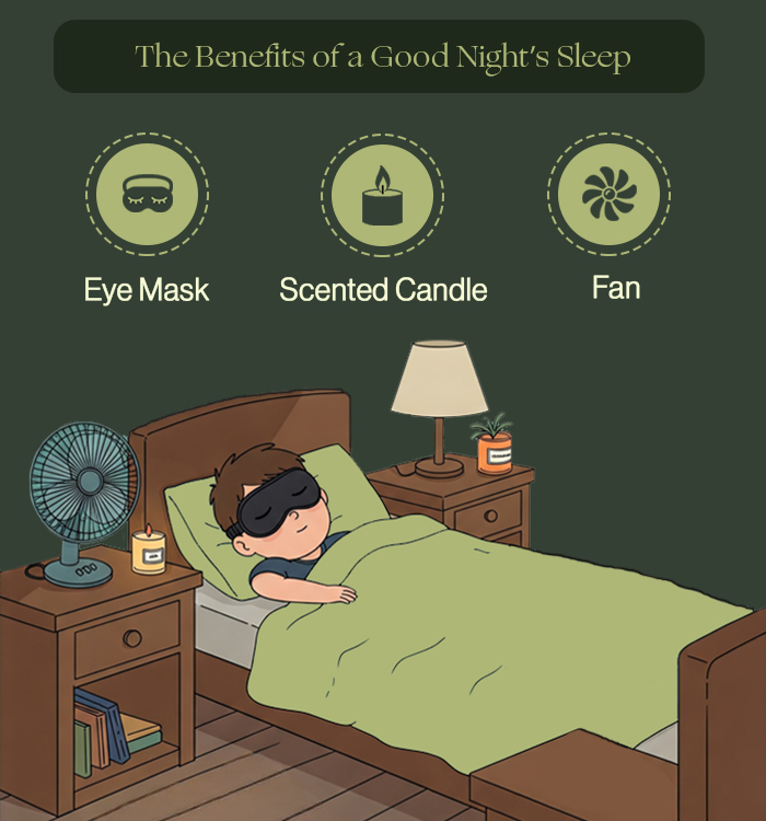 • Use blackout curtains or an eye mask to limit light exposure, which can disrupt sleep.
