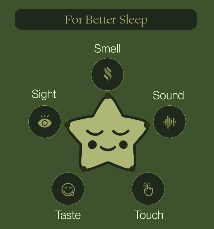 5-Senses Tip-TASTE: Avoid caffeine at least 6 hours before bedtime and opt for a relaxing herbal tea, like chamomile, to wind down. Chamomile and valerian root teas have natural calming effects that support relaxation without stimulants.