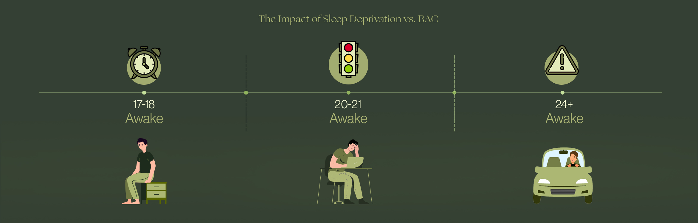 • Staying awake for 17-18 hours is equivalent to having a BAC of 0.05%, impairing your reaction time and focus. At 20-21 hours awake, this increases to 0.08%, the legal intoxication limit in many countries. Severe sleep deprivation (24+ hours) is comparable to a BAC of 0.10% or higher, leading to significant judgment and coordination issues. Prioritizing sleep not only improves mental clarity but also reduces the risks associated with impaired performance.